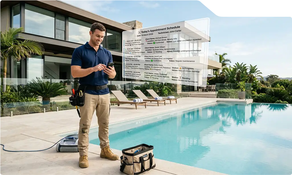 This enables users to filter out specific services, be it pool repairing or maintenance services, view available time slots through an intuitive calendar, and make secure online transactions. The system is capable of handling complex scheduling rules, for example, if a user is trying to book a certain date that falls under holidays, an auto-generated email or SMS is sent to the customer right away.